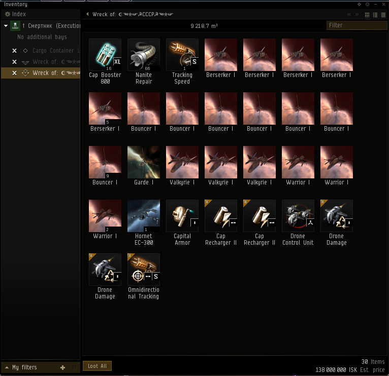 EDIT: Подсчитал итоги дня, и поправил битую ссылку на кб. Я, понятное дело, не собираюсь выдавать килы резистов за elite pvp, и т.п., но для полноты картины их пришлось сюда включить. В целом, лут и ущерб совершенно не радуют. Но все это окупилось баттхертами карибасов, которые нам с непривычки вообще показались адовыми, и ради которых мы собственно и старались. А позже мы узнали, что обнесенная и выселенная из вх корпа так и не шмогла вернуться туда =)